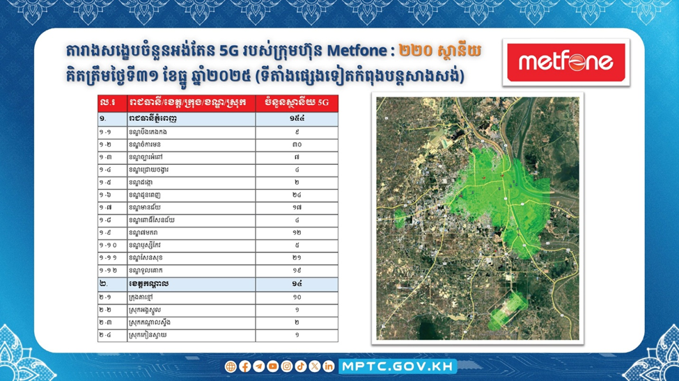 គូសបញ្ជាក់ដែរថា អ្នកប្រើប្រាស់សេវាទូរស័ព្ទចល័តរបស់ប្រតិបត្តិករទាំង៣ អាចចាប់ផ្តើមប្រើប្រាស់សេវា 5G បាន ចាប់ពី ម៉ោង ០០:០១ ថ្ងៃទី១ ខែមករា ឆ្នាំ២០២៦ តទៅ ដោយនៅដំណាក់កាលដំបូង សេវា 5G នឹងត្រូវដាក់ឱ្យ ប្រើប្រាស់នៅរាជធានីភ្នំពេញ និងតំបន់សំខាន់ៗមួយចំនួនក្នុងខេត្តសៀមរាប ខេត្តកណ្តាល ខេត្តស្វាយរៀង ខេត្តកំពង់ស្ពឺ ខេត្តតាកែវ ខេត្តកំពង់ចាម ខេត្តកំពង់ធំ ខេត្តព្រៃវែង ខេត្តក្រចេះ ខេត្តកំពង់ឆ្នាំង ខេត្តពោធិ៍សាត់ ខេត្តព្រះសីហនុ ខេត្តស្ទឹងត្រែង និងខេត្តកំពត។